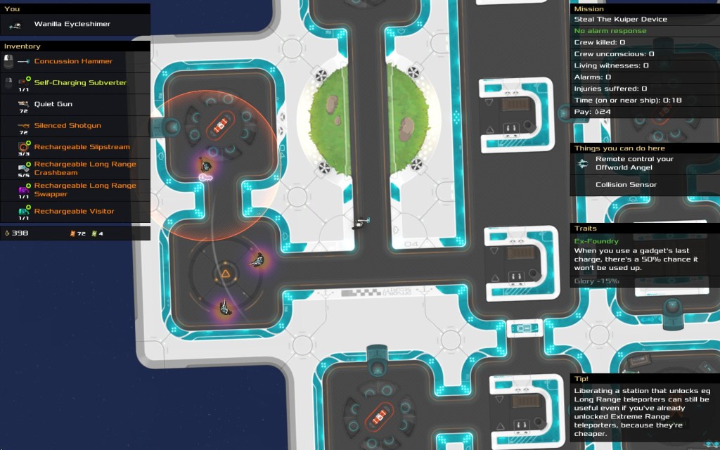 The game takes place in a part of the galaxy which is controlled by four factions; Glitchers, Offworld Security, Foundry, and Sovereign. Your job as a player is to take on various contracts around that system, gaining acid (the game’s currency) and fame. With enough fame you can liberate occupied stations, and with enough independent stations, you can drive the all four factions out of your system, which is the ultimate goal of the game. Backstory and lore are delivered by different NPCs sprinkled across stations, telling you more about the different factions and their respective goals. The past is the past, but the future is up to you. Will you jump from ship to ship, killing everyone in sight? Will you sneak around enemies, steal a prototype, and escape unseen? Will you get thrown out into the vacuum of space and suffocate? Player choice is the name of the game. Story apart, the world of Heat Signature is a well built one. Spaceships will look different depending on who’s flying it. Sovereign ships are clean, tightly packed, with white floors and black polygonal walls, whereas Glitcher ships are generally wider, neon-colored, and with junk all over the floor. Without getting into the gameplay too much yet, the world is also believable. Enemies will panic when they comrades go on patrol to only to never come back, and should the player trigger an alarm, the captain will either call for reinforcements, or dock at the nearest station.